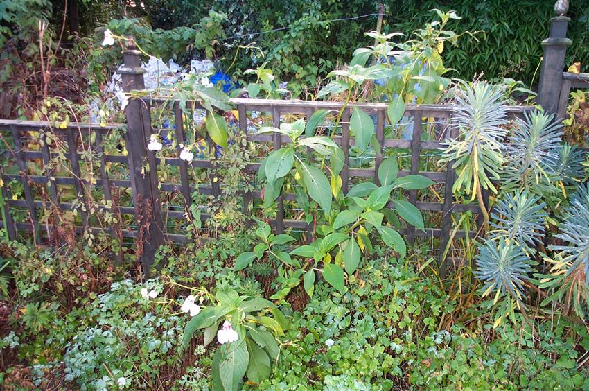 The plant is actually planted at the other side of this trellis and has grown a strong leg through to this side.
